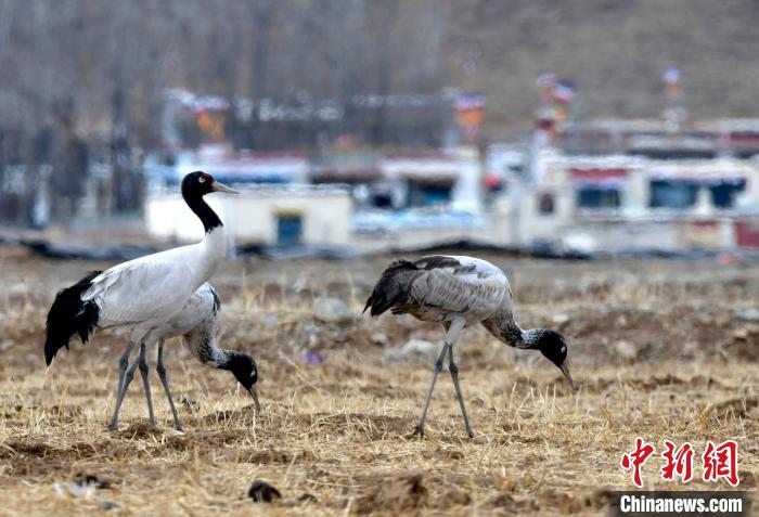 黑頸鶴是全球十五種鶴類中唯一在高原地區(qū)繁殖和越冬的鶴類,被譽為“高原神鳥”,屬中國國家一級保護動物。每年10月中下旬左右,黑頸鶴陸續(xù)飛抵雅魯藏布江中游河谷等地越冬。圖為3月8日,西藏拉薩林周縣黑頸鶴保護區(qū),黑頸鶴在田間覓食。中新社記者 李林 攝