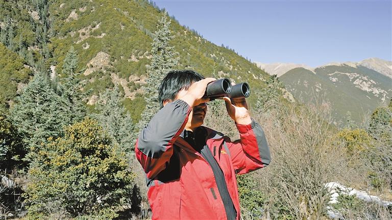 貢覺(jué)縣則巴鄉(xiāng)夏日村的護(hù)林員用望遠(yuǎn)鏡眺望巡查林區(qū)。記者 貢秋曲措 通訊員 董燕 西繞丹青 攝