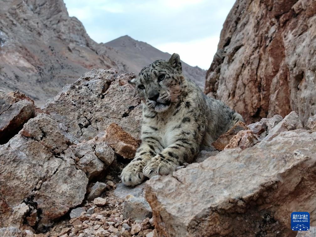 西藏阿里改則縣改則鎮(zhèn)玉多村附近巖山區(qū)域拍攝到的國家一級保護(hù)動物雪豹(4月18日攝)。新華社發(fā)(索朗仁青 攝)