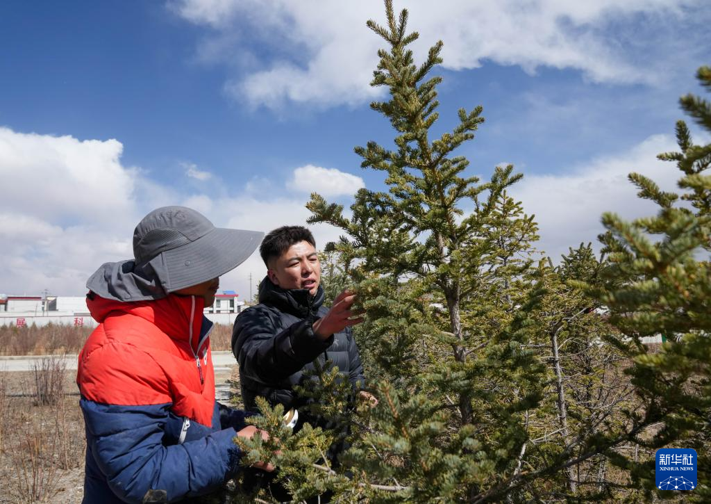4月25日,那曲市林業(yè)和草原局工作人員在檢查樹木長勢。新華社記者 丁增尼達 攝