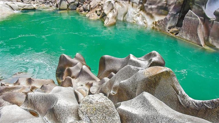 察隅縣千年水磨巖適合觀賞期在春、秋、冬三季的枯水期。此時水位下降、巖石露出,水色澄碧、怪石嶙峋,石頭似臥犀、似河馬、似龍爪、似漏斗、似波浪,形態(tài)多變,與森林、水流、高山懸崖相呼應(yīng),組合成難得一見的山水畫卷。