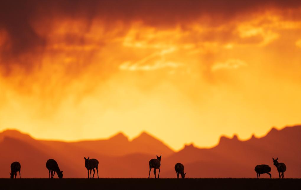 2024年6月16日,在羌塘國家級自然保護(hù)區(qū)境內(nèi)的西藏那曲市申扎縣買巴鄉(xiāng)魯確塘草原上,待產(chǎn)的藏羚羊沐浴在晚霞中。新華社記者費茂華攝