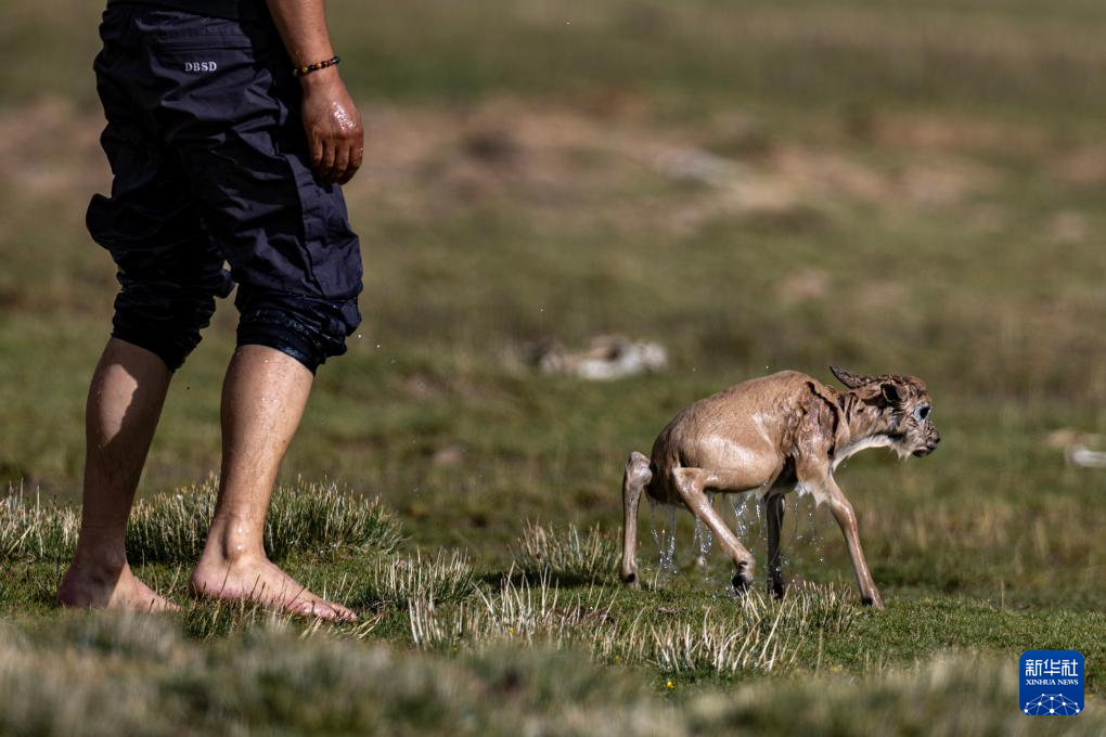 一只被激流沖走的藏羚羊幼崽被管護隊員救上岸(7月14日攝)。新華社記者 姜帆 攝