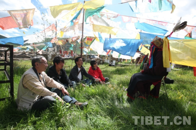2010年,正當(dāng)我準(zhǔn)備前往西藏自治區(qū)林芝市墨脫縣采訪之際,嘉銘先生一個電話使我的西藏行改為了甘孜金馬草原行?!皭勖髦骶?,聽說甘孜州色達(dá)縣有好幾個‘格薩爾’藝人,一個伏藏,一個從石頭里說唱的女藝人!”他在電話里興奮得發(fā)出從未有過的高聲?!皝戆?!我陪你,我們一起去!”征得社長同意,我立刻飛赴成都,坐上他早已聯(lián)絡(luò)安排好的越野車,直接趕往色達(dá)縣。沿途滿目都是兩年前大地震的痕跡遺留,觸目驚心,加上早些天的暴雨泥石流,到處都是落石,所幸我們時時安好。