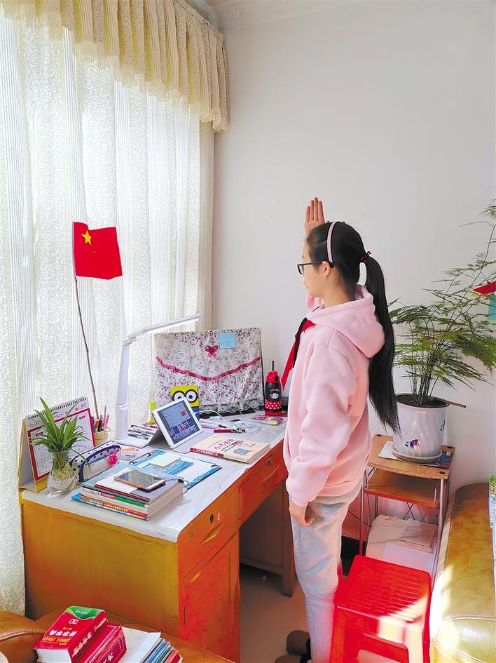 圖為3月3日,拉薩一小的學生在家參加線上升國旗儀式。 記者 周科 通訊員 侯俊 攝