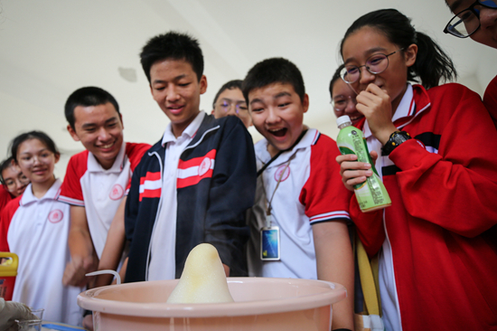 10月26日,北京師范大學海口附屬學校的學生參與化學趣味實驗。當日,北京師范大學??诟綄賹W校舉行第三屆科技人文節(jié)活動,在校內(nèi)營造愛科學、學科學的良好氛圍。[詳細]
