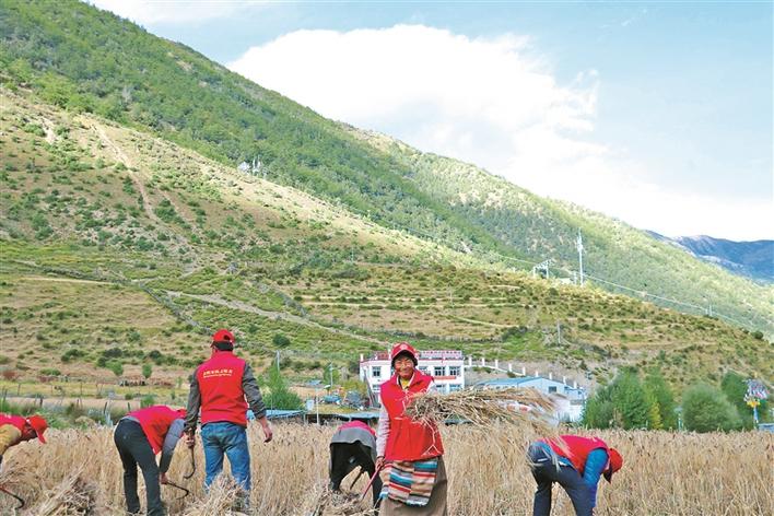 圖為朗縣拉多鄉(xiāng)新時代文明實踐巾幗志愿服務隊的隊員們正在幫助村民收割青稞。胡照躍 攝