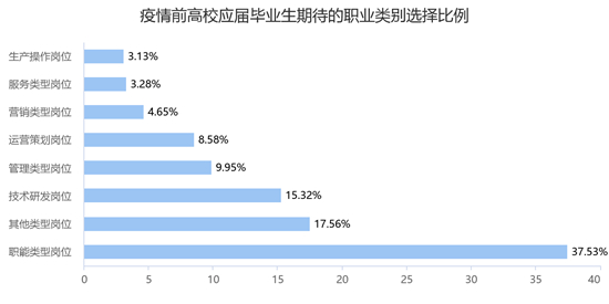 疫情前應(yīng)屆畢業(yè)生期待的職業(yè)類別選擇比例由高到低依次為職能類型崗位(如行政、人事、財(cái)務(wù)等,37.53%)、其他類型崗位(17.56%)、技術(shù)研發(fā)崗位(如研發(fā)工程師、測(cè)試等,15.32%)、管理類型崗位(9.95%)、運(yùn)營(yíng)策劃崗位(如運(yùn)營(yíng)、產(chǎn)品、設(shè)計(jì)等,8.58%)、服務(wù)類型崗位(如客服、服務(wù)員、店員等,3.28%)、生產(chǎn)操作崗位(如職業(yè)業(yè)生產(chǎn)崗位等,3.13%)。疫情后和疫情前完全一致,選擇比例由高到低依次為職能類型崗位(37.65%)、其他類型崗位(18.08%)、技術(shù)研發(fā)崗位(14.67%)、管理類型崗位(9.79%)、運(yùn)營(yíng)策劃崗位(8.40%)、服務(wù)類型崗位(3.53%)、生產(chǎn)操作崗位(3.18%)。