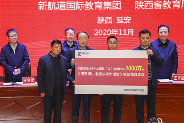 2020年是脫貧攻堅的決戰(zhàn)決勝之年。繼陜西省56個貧困縣(區(qū))全部實現(xiàn)“脫貧摘帽”之后,又收到一份教育大禮——由新航道國際教育集團捐贈的價值2000萬元的《用英語講中國故事》視頻課程。當(dāng)天,陜西省教育廳副廳長王海波與新航道國際教育集團董事長兼CEO胡敏共同出席在宜川中學(xué)舉行的捐贈儀式,開啟新航道國際教育集團助力陜西教育扶貧的新篇章。