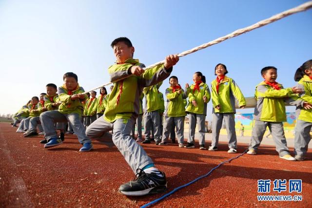 11月12日,學(xué)生在大課間參加拔河比賽。 位于山東省青島市即墨區(qū)的青島藍(lán)谷高新區(qū)東皋埠小學(xué)是一所鄉(xiāng)村學(xué)校,近年來,學(xué)校開展以乒乓球、籃球、跳繩等運(yùn)動為主的大課間活動,讓孩子們在享受運(yùn)動的同時愉悅身心,增強(qiáng)體質(zhì)。 新華社發(fā)(梁孝鵬攝)