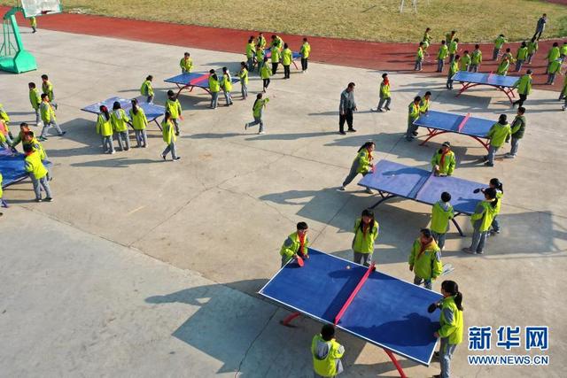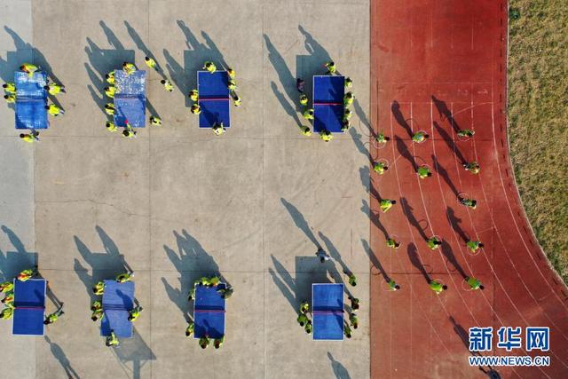 11月12日,學(xué)生在大課間打乒乓球(無人機(jī)照片)。 位于山東省青島市即墨區(qū)的青島藍(lán)谷高新區(qū)東皋埠小學(xué)是一所鄉(xiāng)村學(xué)校,近年來,學(xué)校開展以乒乓球、籃球、跳繩等運(yùn)動為主的大課間活動,讓孩子們在享受運(yùn)動的同時愉悅身心,增強(qiáng)體質(zhì)。 新華社發(fā)(梁孝鵬攝)