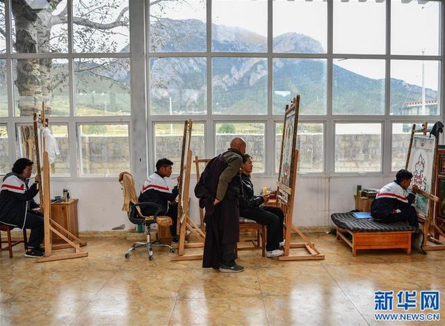 嘎瑪?shù)吕绽先嗽谖鞑夭际锌ㄈ魠^(qū)嘎瑪鄉(xiāng)的民族手工藝培訓(xùn)基地里教學(xué)員們畫唐卡(10月3日攝)。新華社記者 晉美多吉 攝