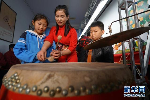11月24日,皮影戲藝人在河北省沙河市西油村小學(xué)指導(dǎo)學(xué)生打鼓。