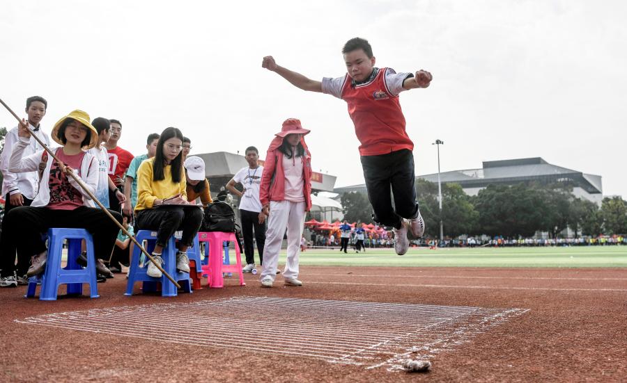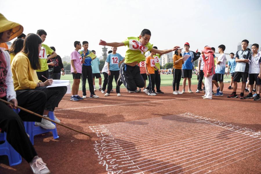 11月26日, 廣西大學(xué)附屬中學(xué)初中年級(jí)學(xué)生在立定跳遠(yuǎn)比賽中。新華社記者張愛(ài)林?jǐn)z