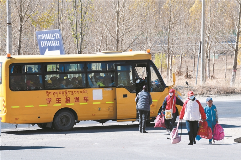 圖為在堆龍德慶區(qū)古榮鎮(zhèn)生態(tài)搬遷點(diǎn),學(xué)生走下校車。貢嘎來松攝