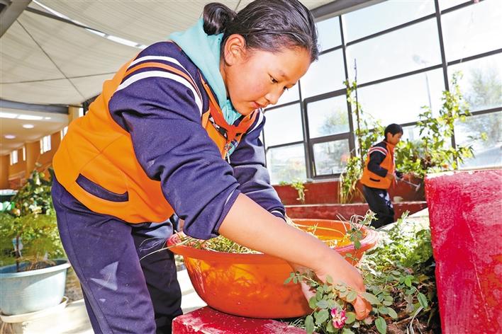 日喀則市上海實驗學(xué)校的學(xué)生在種植專業(yè)課上學(xué)習(xí)種植花卉。