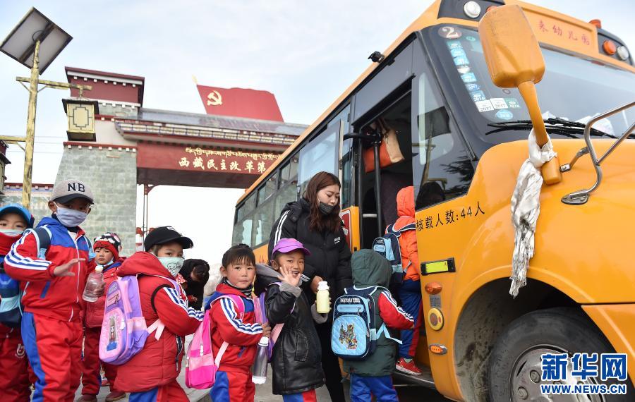 “西藏民主改革第一村”——西藏山南市乃東區(qū)昌珠鎮(zhèn)克松村的孩子們登上校車(chē),出發(fā)去幼兒園(2018年3月27日攝)。新華社記者覺(jué)果 攝
