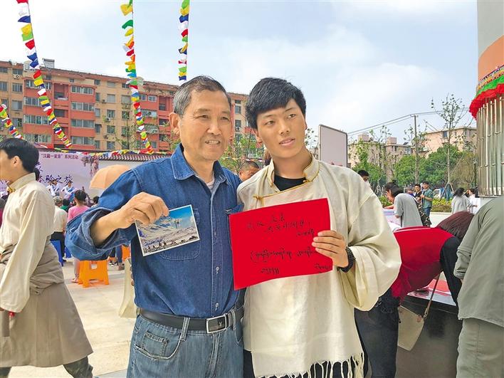 圖為江蘇省南通中學(xué)藏文化社團(tuán)在南通市北濠社區(qū)開(kāi)展藏文化宣傳與展示活動(dòng)時(shí),藏族學(xué)生把藏文書(shū)寫(xiě)的明信片贈(zèng)送給當(dāng)?shù)厥忻瘛?圖片由江蘇省南通中學(xué)提供