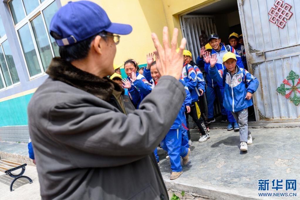 5月4日,在西藏昌都市類烏齊縣長毛嶺鄉(xiāng)第一小學(xué),學(xué)生們向李純民道別。新華社記者 劉金海 攝
