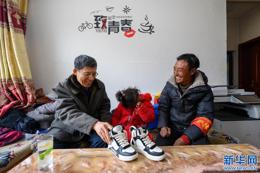 5月3日,在西藏昌都市類烏齊縣伊日鄉(xiāng)小學(xué),扎西措姆(中)在父親帕巴澤仁(右)的陪伴下,接受李純民(左)贈予的一雙為她專門定制的新鞋。扎西措姆自幼患有足部殘疾,穿普通鞋子無法舒適行走。2020年,李純民個人出資為扎西措姆定制了一雙鞋。不久前,得知扎西措姆的鞋子穿破后,李純民再次為她定制了一雙新鞋。新華社記者 劉金海 攝