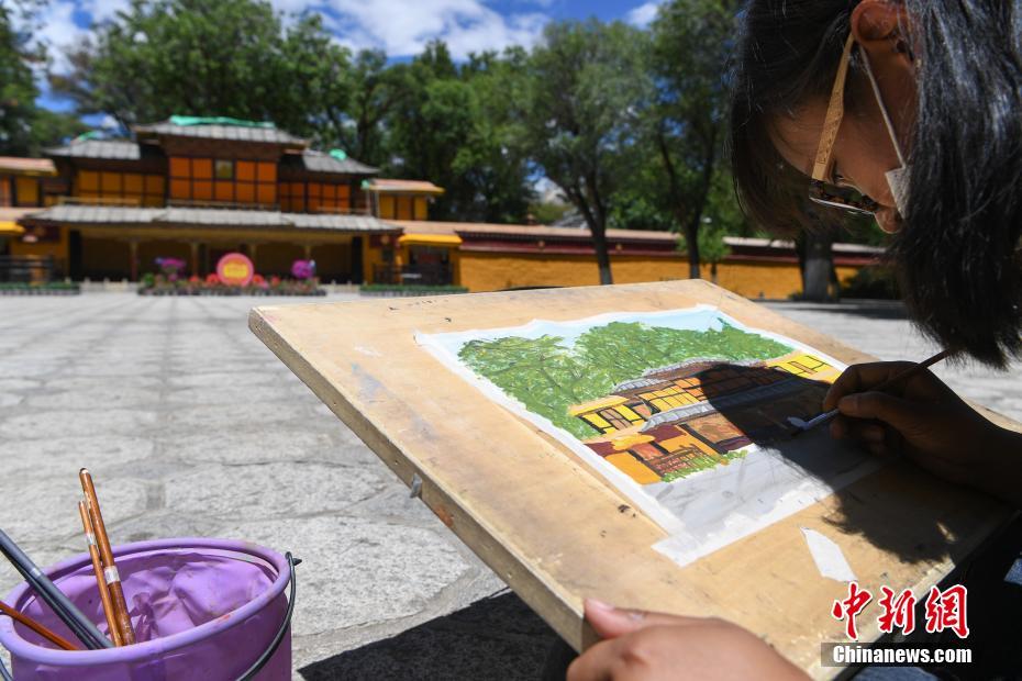 圖為西藏大學(xué)建筑系學(xué)生正在手繪羅布林卡內(nèi)的建筑。 中新社記者 貢嘎來松 攝