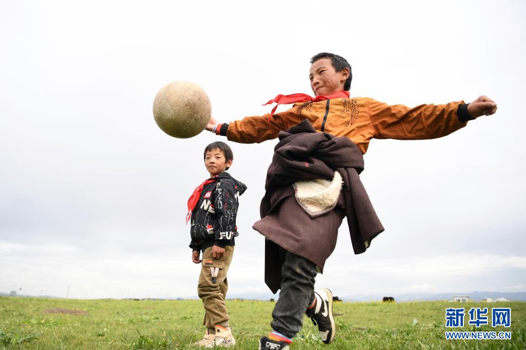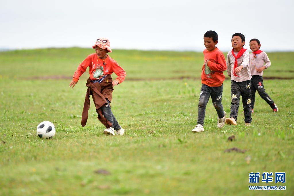 7月14日,河曲馬場小學學生參交羅布藏(右)和同伴在草原上踢足球。新華社記者 陳斌 攝