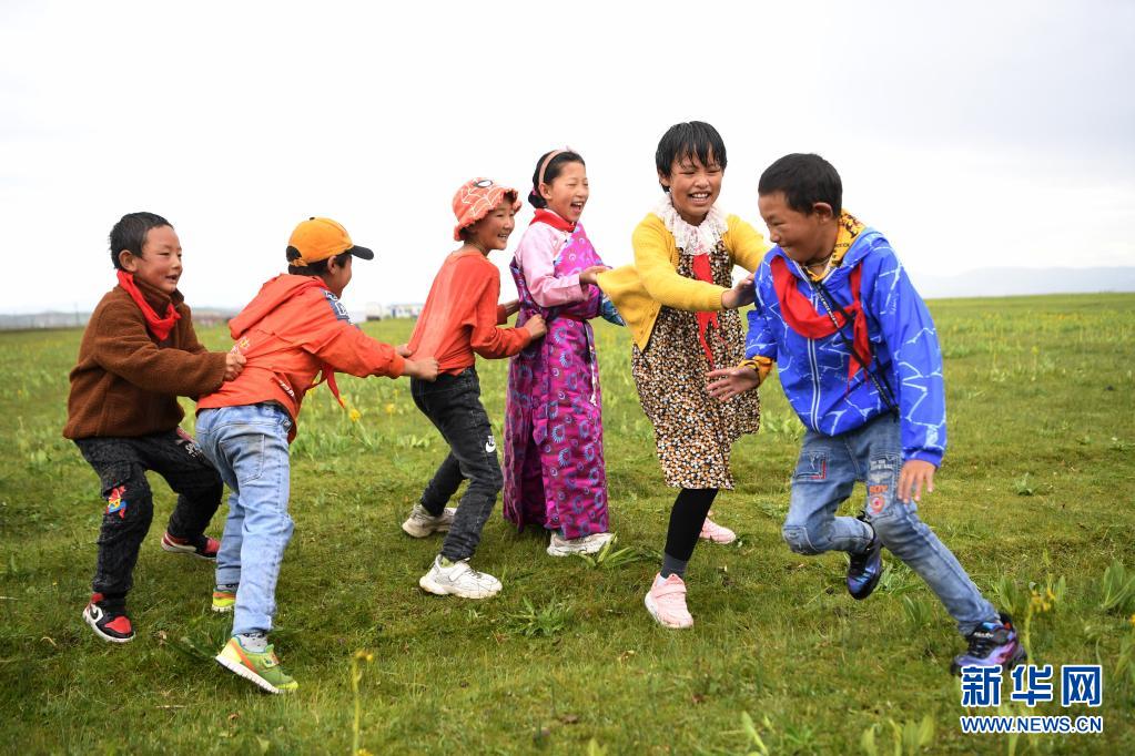 暑假來臨,在海拔3000多米的甘肅省甘南藏族自治州瑪曲草原上,瑪曲縣河曲馬場小學的孩子們在老師的帶領下,暫別課堂學習,用豐富多彩的游戲開啟歡樂暑假時光。