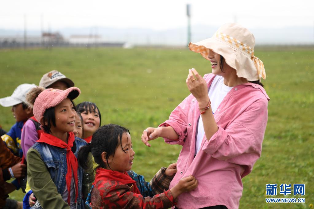 7月14日,河曲馬場小學老師余妙妍(右一)在草原上和孩子們做游戲。新華社記者 陳斌 攝