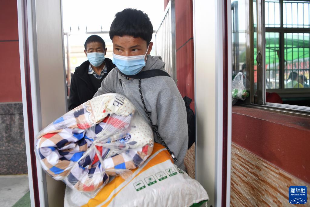 碌曲縣藏族中學(xué)高一新生帶著行李通過測溫門到學(xué)校報到(8月30日攝)。新華社記者 陳斌 攝