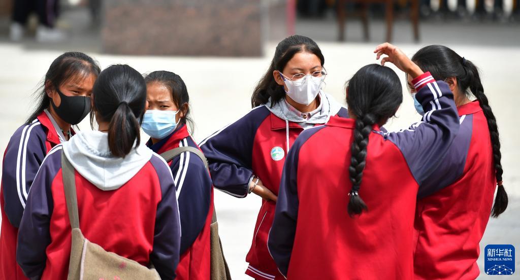 碌曲縣藏族中學(xué)的幾名高二學(xué)生在校園里交流(8月30日攝)。新華社記者 陳斌 攝