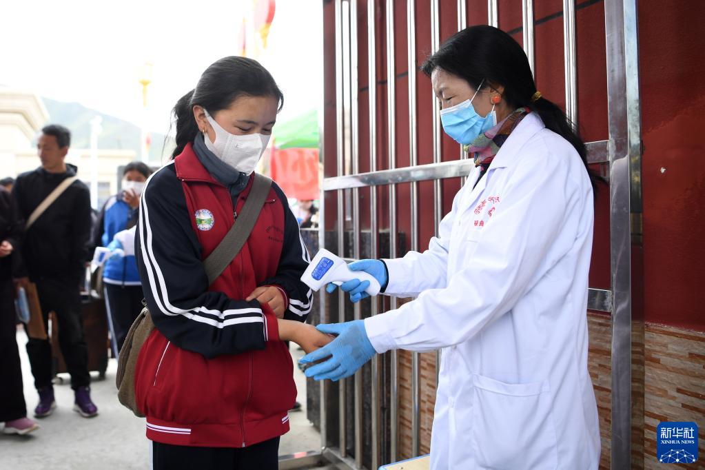 碌曲縣藏族中學(xué)學(xué)生進(jìn)入校園時測量體溫(8月30日攝)。新華社記者 杜哲宇 攝