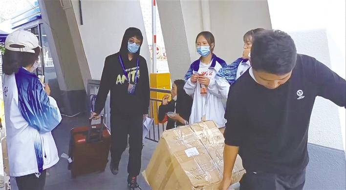 據(jù)迎新工作人員介紹,新生入校后,黨員志愿服務(wù)隊(duì)會對新生進(jìn)行身份核驗(yàn)、測體溫,學(xué)生志愿服務(wù)隊(duì)會幫新生將行李搬運(yùn)至新生報(bào)到處,新生在報(bào)到處辦理好入學(xué)手續(xù)后,志愿服務(wù)隊(duì)的工作人員還會負(fù)責(zé)將學(xué)生行李搬運(yùn)至新生宿舍。
