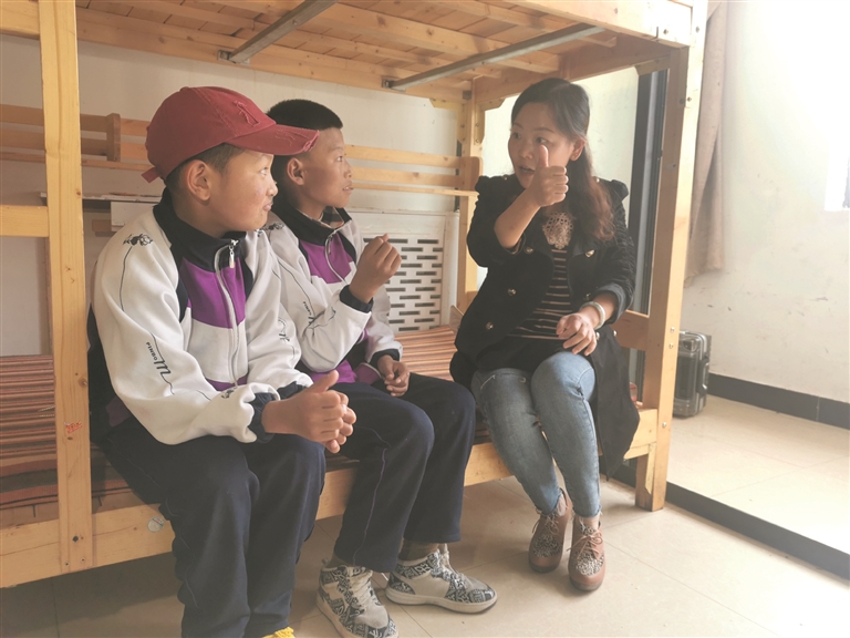 拉薩市特殊教育學(xué)校的老師譚倩和學(xué)生在宿舍里交流。