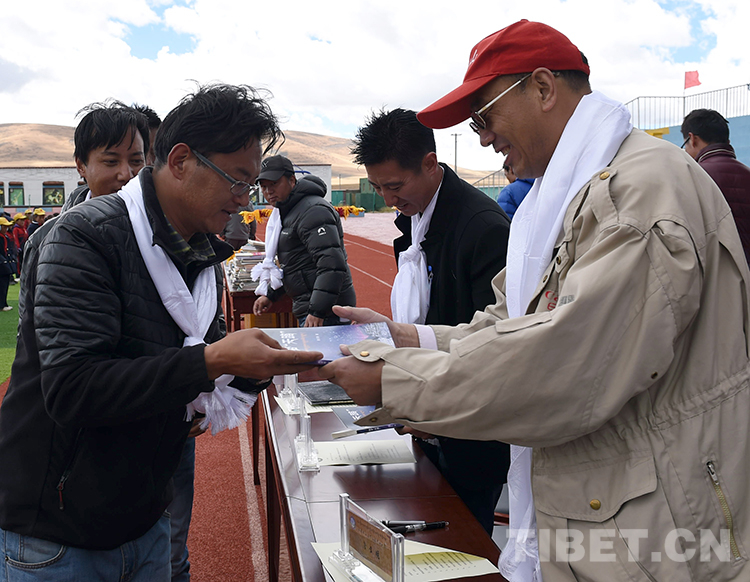 這是唐召明在向西藏那曲地區(qū)那曲縣(現(xiàn)那曲市色尼區(qū))師生捐贈自己所撰寫的《圓夢“天路”》一書(王博軒2016年10月5日攝)