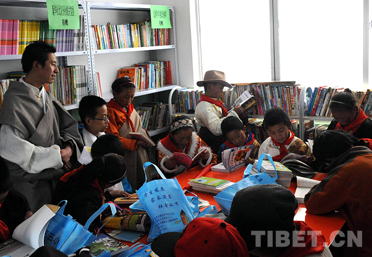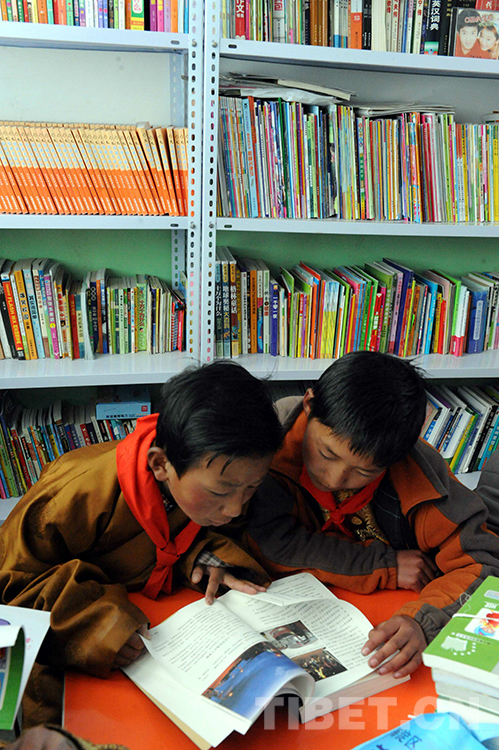 這是西藏那曲地區(qū)那曲縣(現(xiàn)那曲市色尼區(qū))羅瑪鎮(zhèn)中心小學學生在新建的“愛心書屋”快樂地讀書(唐召明2014年5月29日攝)