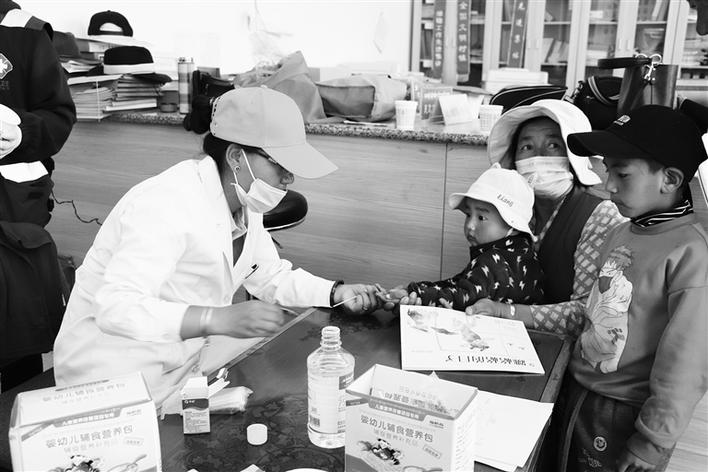工作人員為兒童檢查身體并免費發(fā)放“營養(yǎng)包”。圖由西藏自治區(qū)衛(wèi)健委婦幼健康處 提供