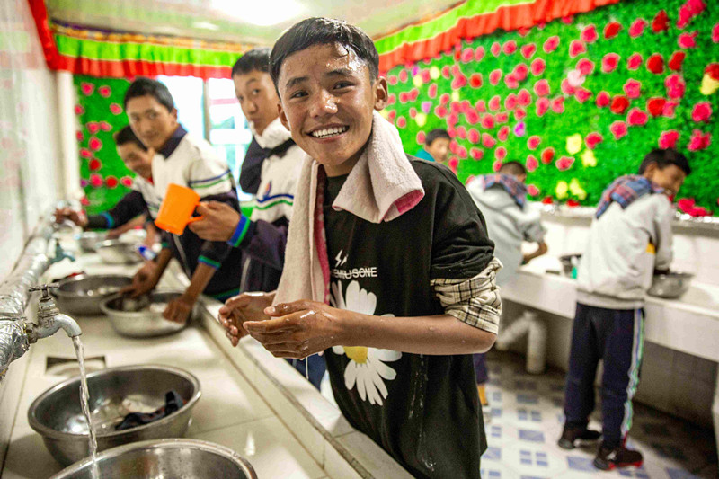 走進薩迦中學(xué)新投入使用的女生宿舍樓,可以看到每個房間門口都布置了信息欄,詳細介紹了入住學(xué)生信息、室長和帶教老師信息;門口統(tǒng)一配備鞋架,孩子們在門口換好鞋再進房間,保持了室內(nèi)地面的清潔。室內(nèi)外隔間是統(tǒng)一的儲物柜,存放學(xué)生私人用品;內(nèi)間是整整齊齊8個上下鋪位,中間合用的臺子上牙刷、水杯整齊劃一擺放;靠窗有統(tǒng)一的臉盆架;每個樓層都有3處盥洗室。由于縣中學(xué)內(nèi)沒有學(xué)生浴室,新宿舍盥洗室內(nèi)還特地安裝了電加熱的恒溫暖水設(shè)備。入冬后,薩迦中學(xué)的孩子們終于能夠在宿舍洗漱時用上熱水了。