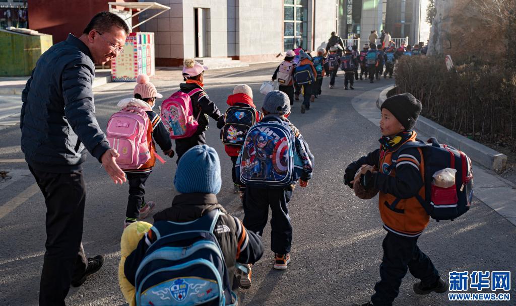 援藏教師潘杰送學(xué)生放學(xué)(2021年12月9日攝)。