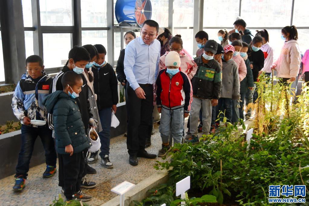 勞動教育課上,援藏教師潘杰和藏族學(xué)生在一起(2021年9月14日攝)。