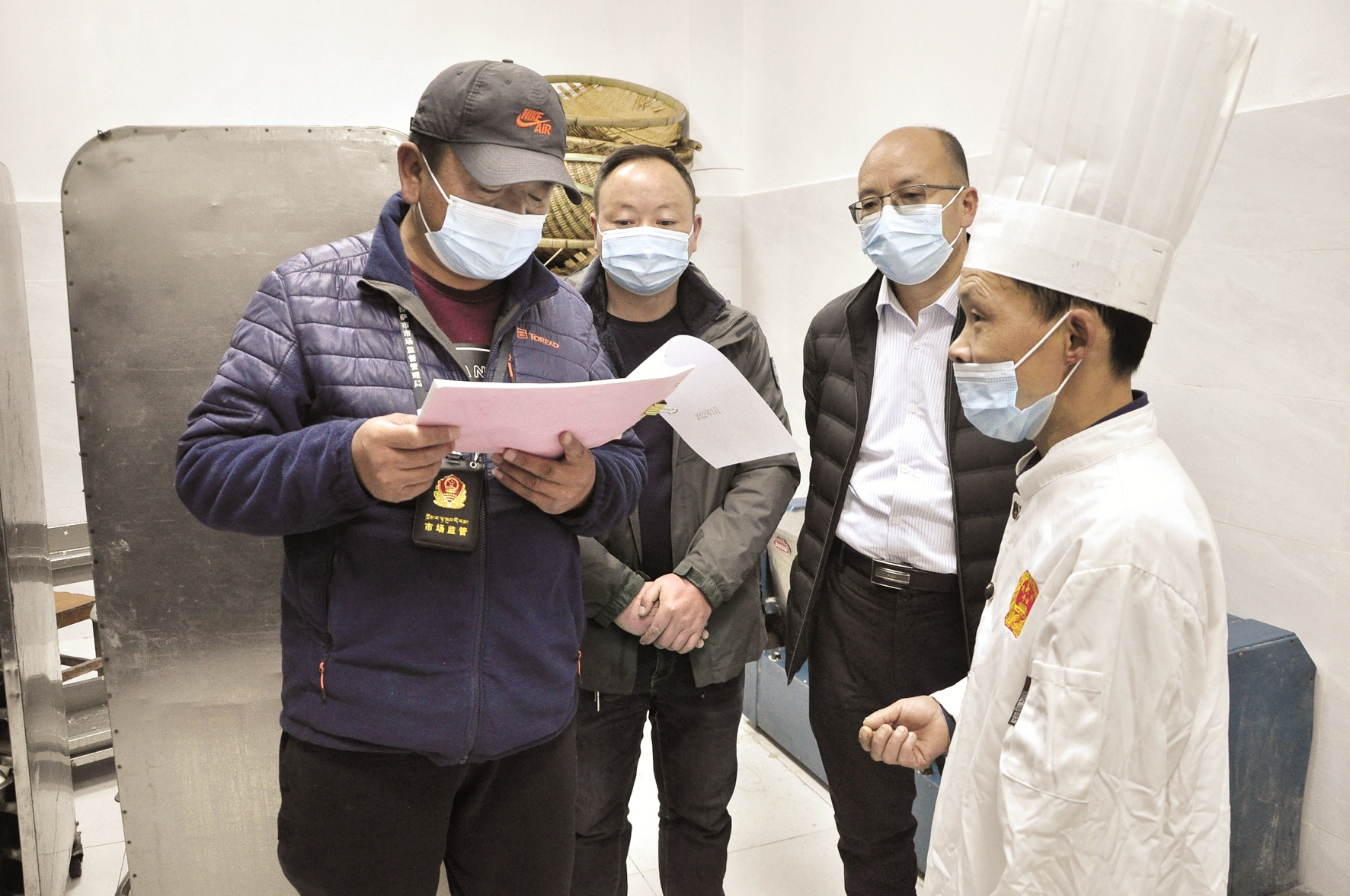 市市場監(jiān)督管理局執(zhí)法人員一行來到拉薩市北京中學學生食堂,檢查餐廳環(huán)境衛(wèi)生,隨后來到食堂后廚,查看后廚地面、廚房用具、食材操作間和食品加工工藝流程,現(xiàn)場檢查了消毒柜、食品留樣柜以及索證索票記錄本,指出其中存在的問題。拉薩市北京中學食堂負責人陳小芹告訴記者:“通過今年的招標,拉薩市北京中學的食材供貨商從拉薩凈土更換為地球第三極。如果食材出現(xiàn)任何問題,他們會立刻進行更換。我們會按照市市場監(jiān)督管理局和市教育局的要求,做好食品安全、防疫等各項工作?!?/p>