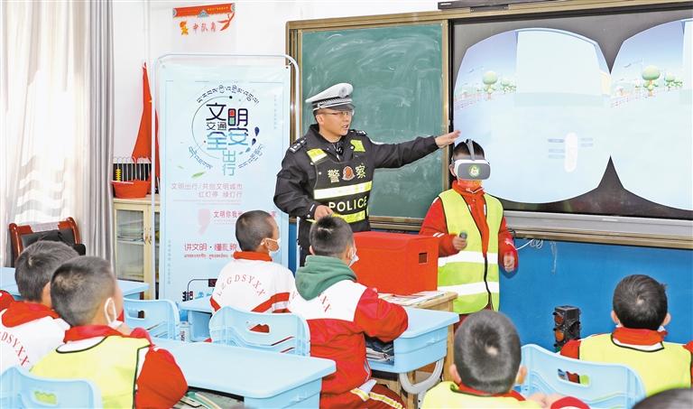 圖為林芝市公安局交警支隊民警通過VR眼鏡,讓學(xué)生更直觀地感受交通場景,提高交通安全意識。記者 彭琦 通訊員 惠盼宏 攝