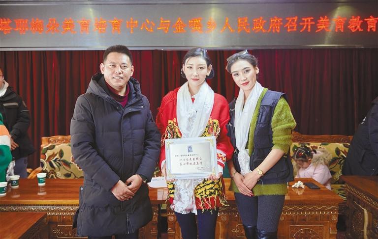 洛桑卓瑪(中)帶領(lǐng)團(tuán)隊(duì)前往日喀則市江孜縣金嘎鄉(xiāng)開(kāi)展美育公益活動(dòng)。