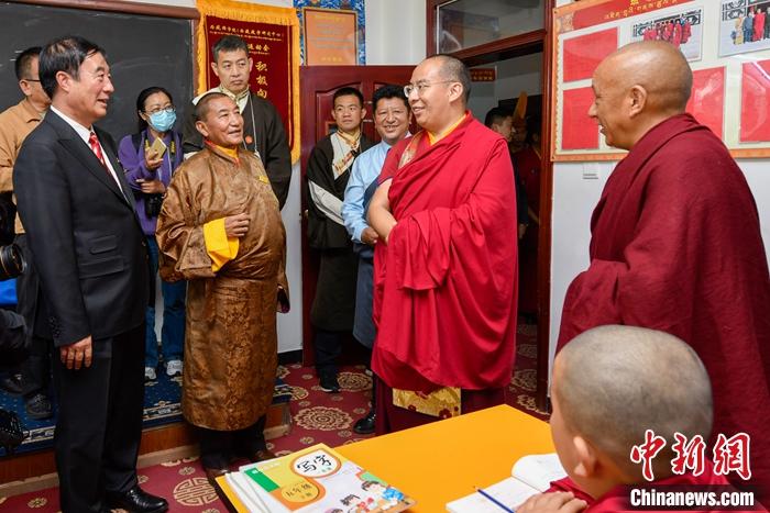 6月16日,班禪來到西藏佛學(xué)院少年活佛班,了解少年活佛們的學(xué)習(xí)、生活情況。中新社發(fā) 李林 攝