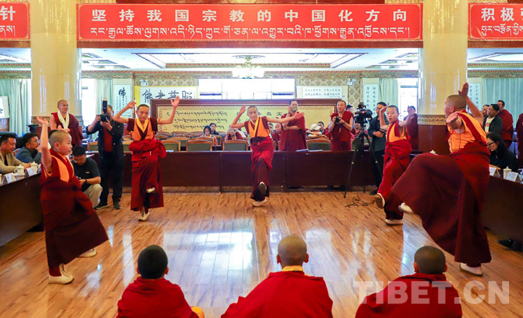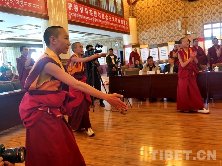 據(jù)了解,與傳統(tǒng)寺廟教育相比,西藏佛學(xué)院開設(shè)有文化課和佛學(xué)兩大體系,天資聰慧的少年活佛們在校期間已經(jīng)開始研習(xí)含義深刻、博大精深的《五部大論》《入菩薩行論》等佛教經(jīng)典作品,目前已經(jīng)可以流暢地背誦部分經(jīng)典。在當(dāng)日的學(xué)習(xí)成果匯報(bào)展示會上,少年活佛們不僅展示了藏漢雙語朗誦、藏漢文書法、英語情景劇等,也為大家?guī)砹恕度肫兴_行論》第一章的背誦展示和辯經(jīng)展示。