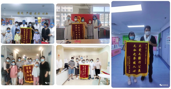 圖為患兒出院前向院方和“同心共鑄中國(guó)心”基金會(huì)敬送錦旗