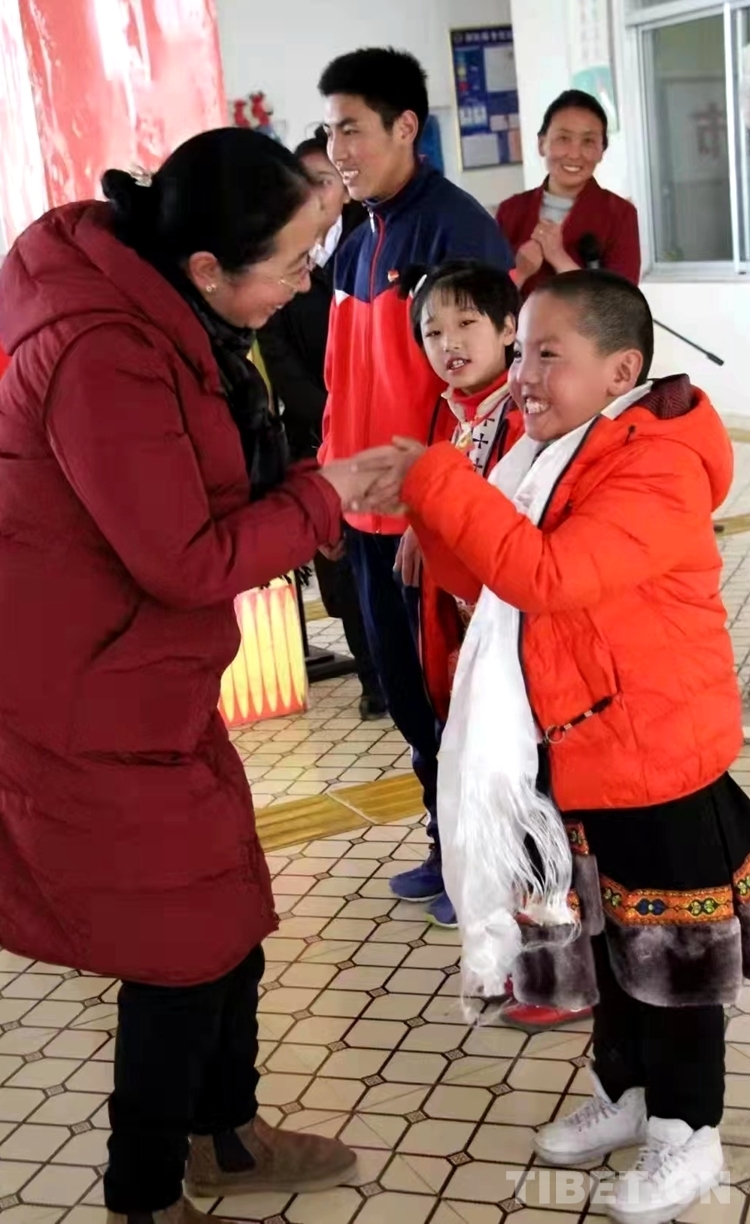 圖為次仁拉姆為那曲市特殊教育學(xué)校學(xué)生獻(xiàn)哈達(dá),半蹲著跟學(xué)生握手,場(chǎng)面非常溫暖