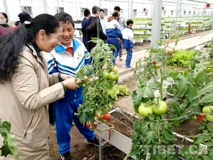 圖為次仁拉姆(左一)帶領(lǐng)那曲市特殊教育學(xué)校學(xué)生們“打卡”參觀那曲市某溫室大棚