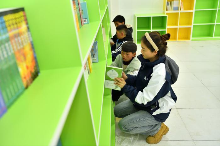 藥山鎮(zhèn)中心小學(xué)的同學(xué)們利用周末時(shí)間協(xié)助整理新閱讀室。