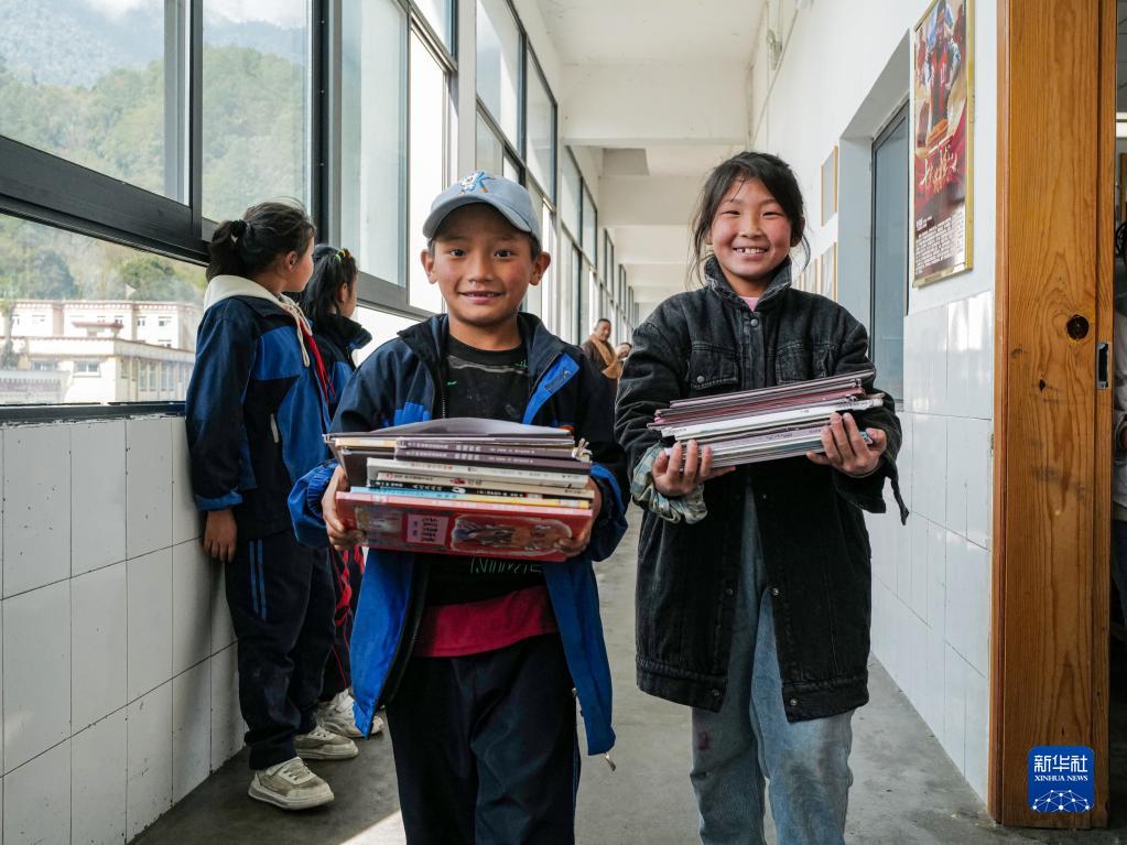 3月31日,學(xué)生們正在向教室的圖書角搬運(yùn)新圖書。新華社記者 洛卓嘉措 攝
