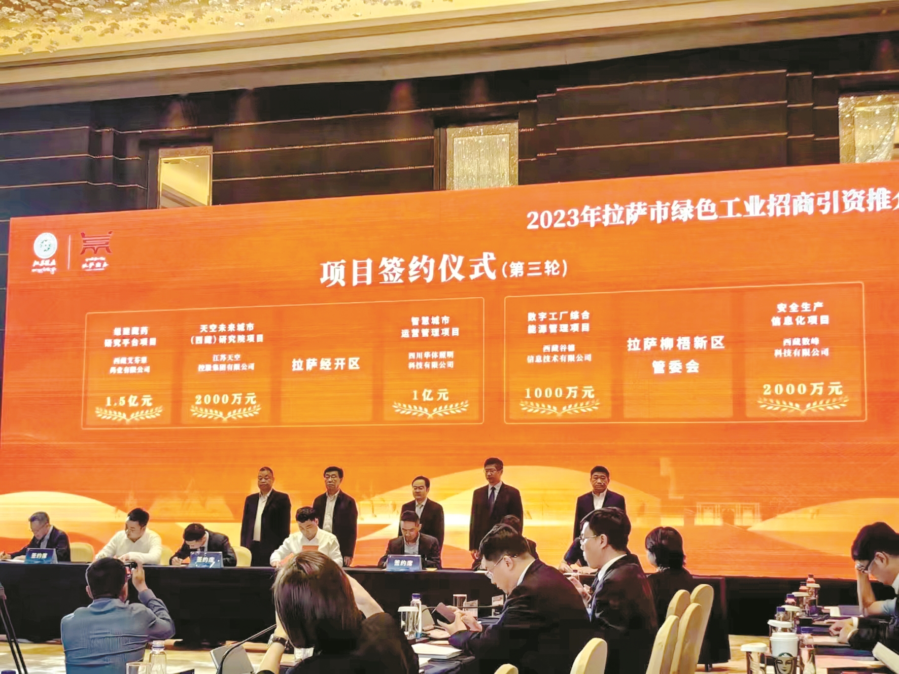 4月17日,2023年拉薩市綠色工業(yè)招商引資推介會暨項目簽約儀式在南京舉行,活動由拉薩市人民政府、西藏自治區(qū)招商局、江蘇援藏前方指揮部主辦,拉薩市商務(wù)局、拉薩經(jīng)濟技術(shù)開發(fā)區(qū)聯(lián)合承辦。江蘇省商務(wù)廳副廳長倪海清、江蘇省工業(yè)和信息化廳二級巡視員宋旭東、西藏自治區(qū)招商局副局長次旦格來應(yīng)邀出席活動并致辭,簽約企業(yè)代表、拉薩市各縣(區(qū))、經(jīng)濟功能園區(qū)分管招商工作負責人以及知名企業(yè)代表近140余人參加推介會。本次推介會共簽約項目15個,協(xié)議投資達32.3億元。